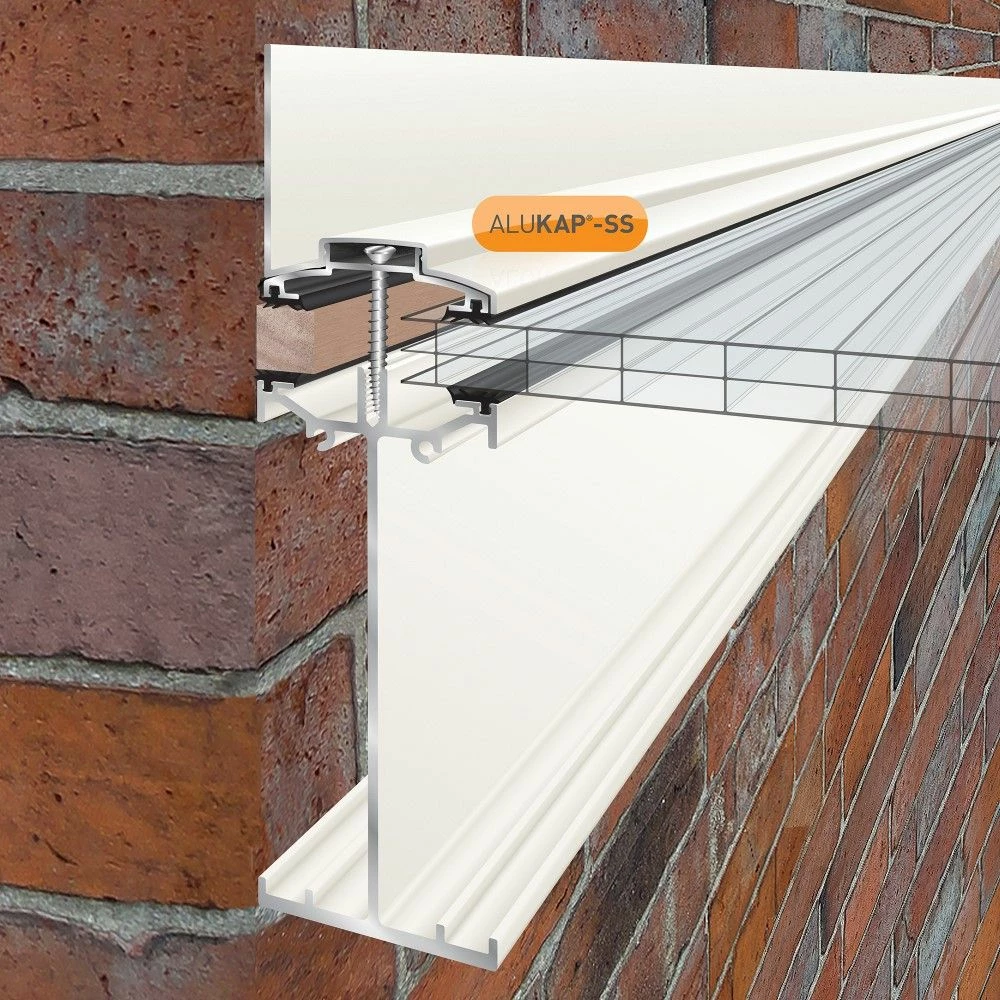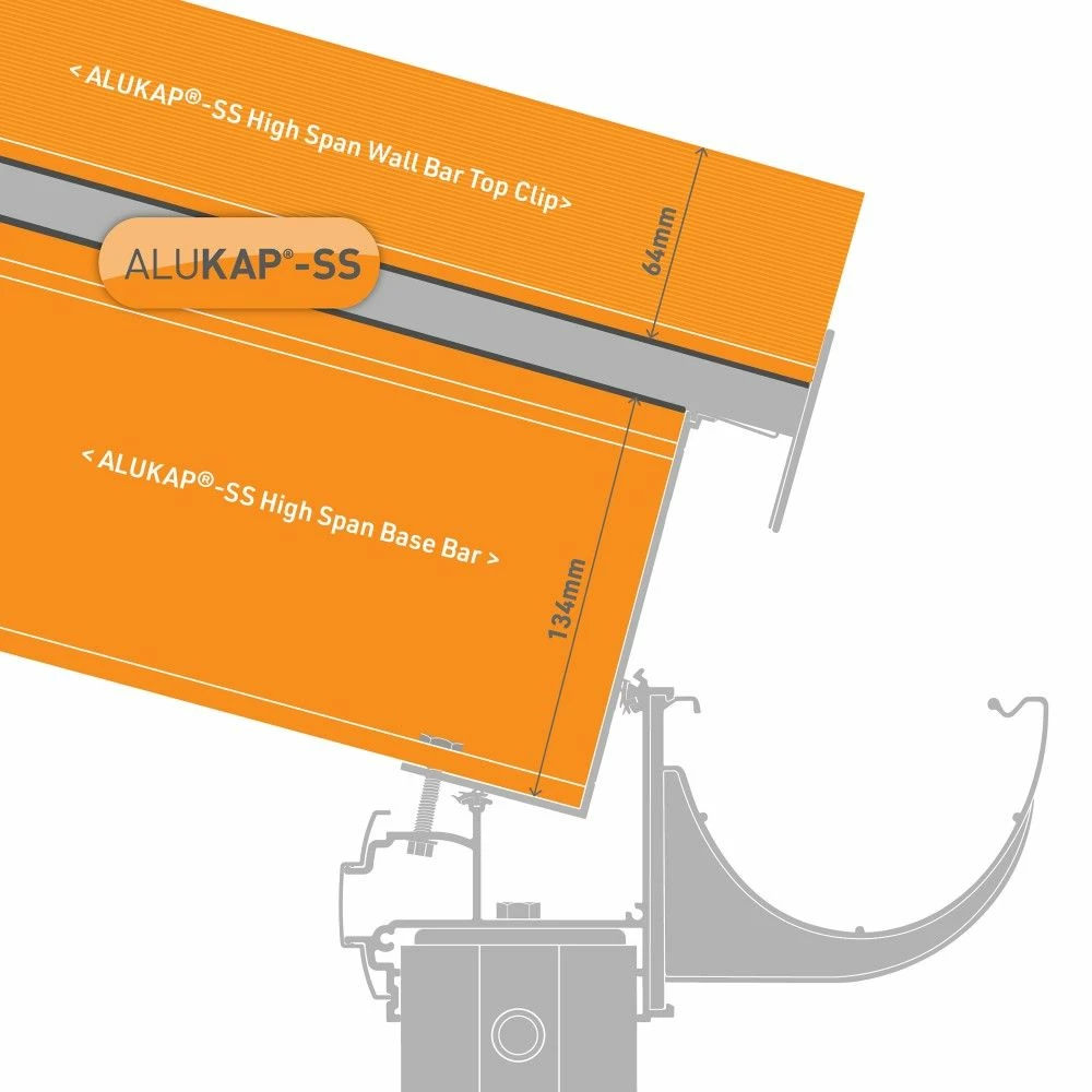 This 58mm x 3,000mm, 134mm thick, White Alukap®-SS High Span Wall Bar provides the perfect glazing finish on any roof where the end rafter abuts a rising wall. The Alukap®-SS Wall Bar integral upstand provides a perfect waterproofing upstand and an excellent detail for lead flashing over. The Alukap®-SS High Span Bar provides an excellent all-aluminium structural beam for unsupported glazing spans up to 6m depending on glazing material and glazing bar centres. Alukap®-SS suits glass or Axiome® polycarbonate of any thickness. The all-aluminium Alukap®-SS system provides a robust, long-lasting aesthetically pleasing finish to any residential, public, or commercial canopy or roofing structure. Estimated load span advice is available upon request, although users are advised to obtain their independent advice to verify the span calculations are correct for their site-specific application.
