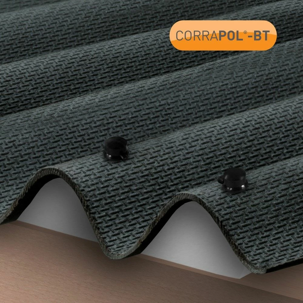 These 5.5mm x 60mm, Black Corrapol®-BT Fixing Screws are designed to be used with our range of Corrapol®-BT Corrugated Bitumen Roofing Sheets when fitting them onto a timber structure. They are available in four colour options, with specially designed caps to closely match the colour of your bitumen sheets. Unlike the Corrapol®-BT Fixing Nails, these screws reduce further the chances of any uplift caused by strong winds. This therefore maximises the lifespan of your bitumen roofing sheets, whether they are being used on a garden shed or agricultural building. The manufacturer recommends at least 20 screws per sheet.
