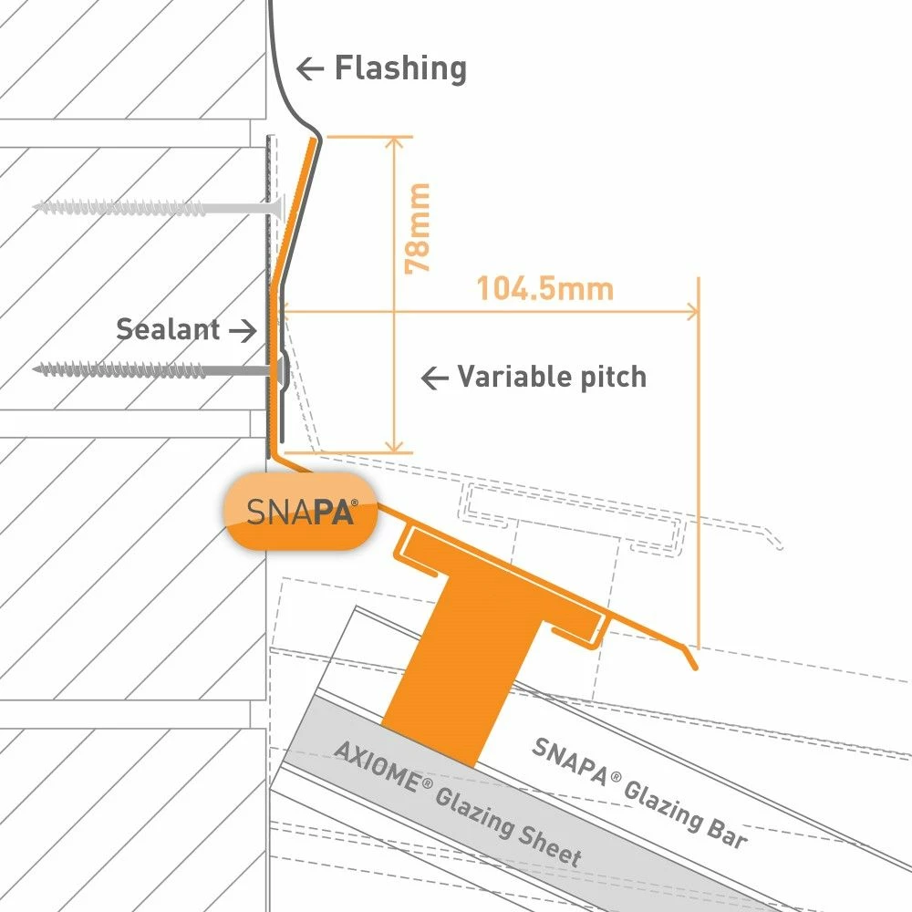 Snapa Top Wall Flashing is a unique and innovative way to finish your roof where the Top is against a wall. Manufactured from Aluminium, the Snapa Top Wall Flashing provides a clean, tidy and neat finish to an previously hard to finish area of your roof, compatible with various roof angles. Included is the Foam gasket allowing you to push down onto the roof to create a seal over the Snapa Lean-to Bars joining the Axiome or Axgard.